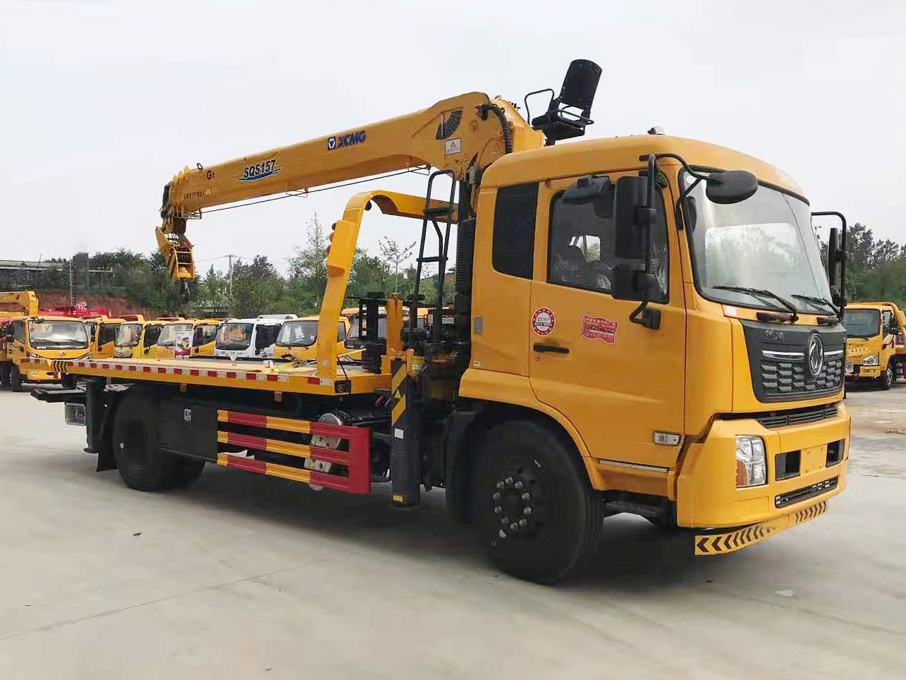 專用功能配置:上裝采用 6mm 高強度花紋板制作,(防滑能力強,承載能力高,外表美觀),該車平板總長度為 6.5米(含尾部板長 1.1 米),寬 2.55 米,平板承載質量為 10噸。采用嘉善取力器,長源泵、意大利海德閥 加兩個平衡閥,液壓油管采用耐壓雙層鋼絲油管,抗壓力達到 18 兆帕,1 個工具箱,配兩個小車(**輪),4 根捆綁帶,L 型抱胎架一對,托叉一對,托叉座一對,鏈鉤一條,后工作燈 2 只,1 個 10噸液壓絞盤(30米鋼絲繩), 10噸三節臂后拖舉.